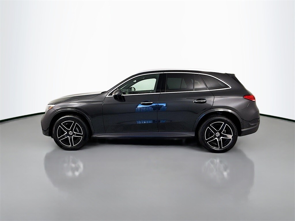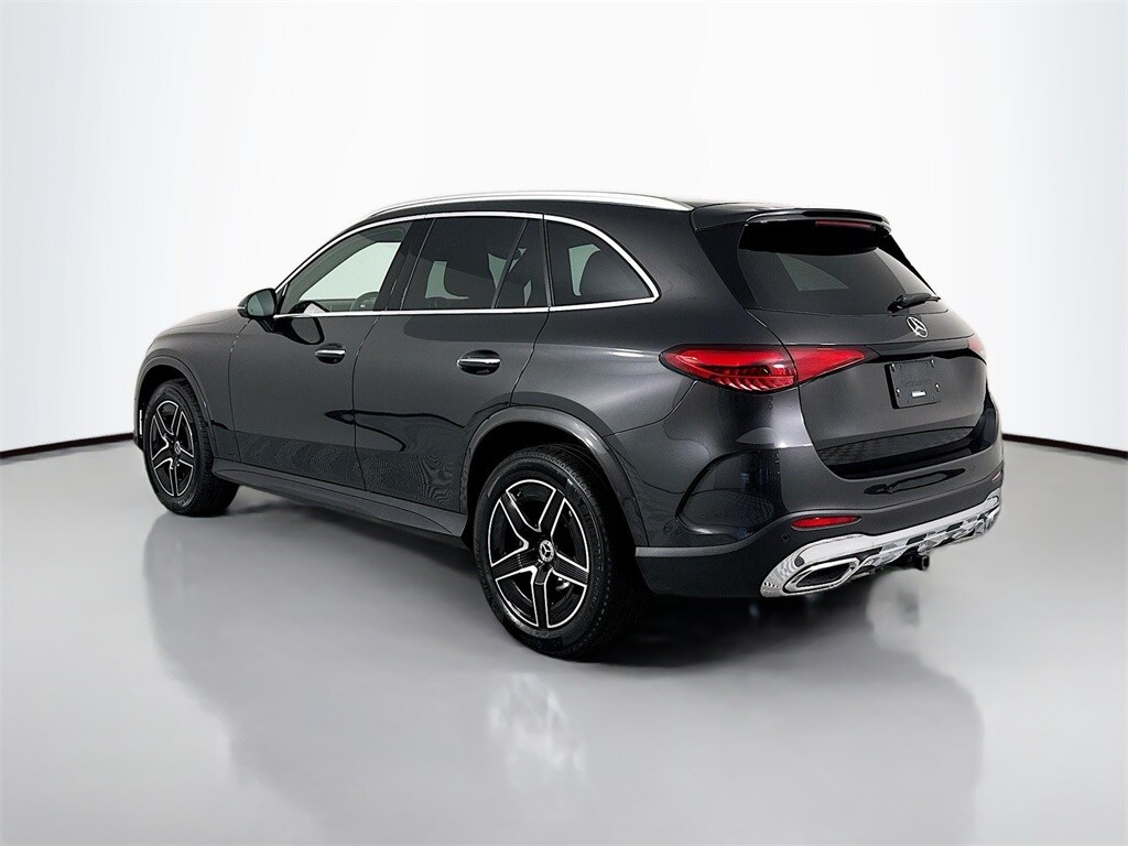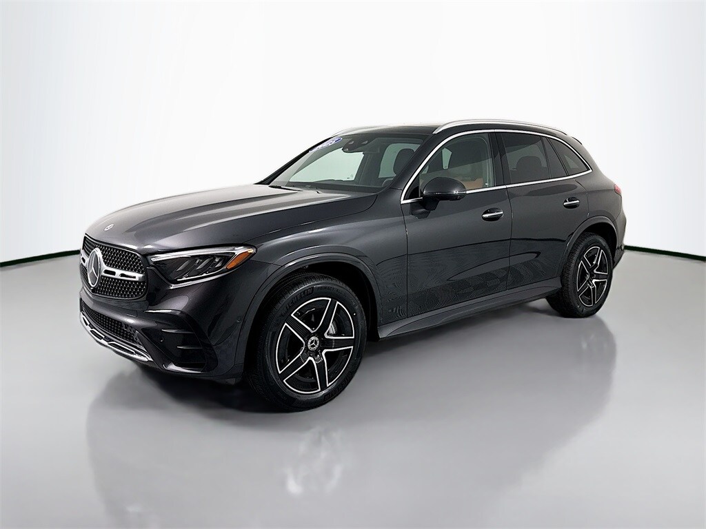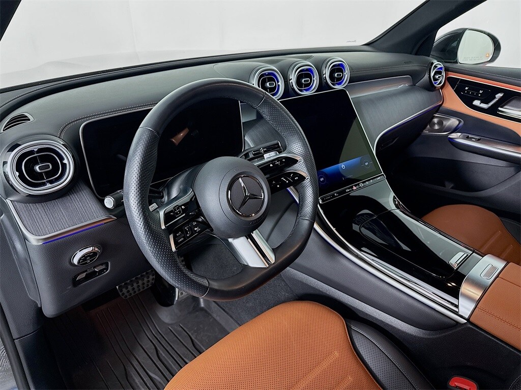 2025 Mercedes-Benz GLC 300 4MATIC 1-owner local trade with 11K miles. LOADED AMG-Line package with optional Driver Assistance Package, panoramic moonroof, special-order Sienna Brown and Black Full Leather interior, heated and ventilated front seats and heated steering wheel, Exclusive Package including surround view, MBUX Premium Navigation, Burmester premium sound and more, plus other line-item options!