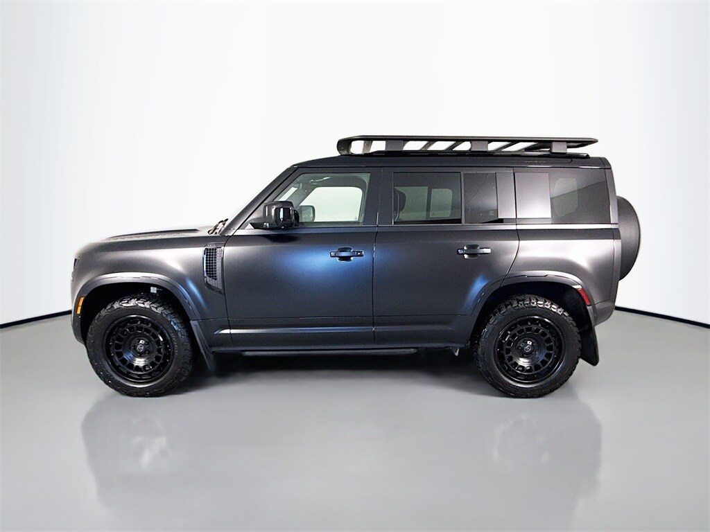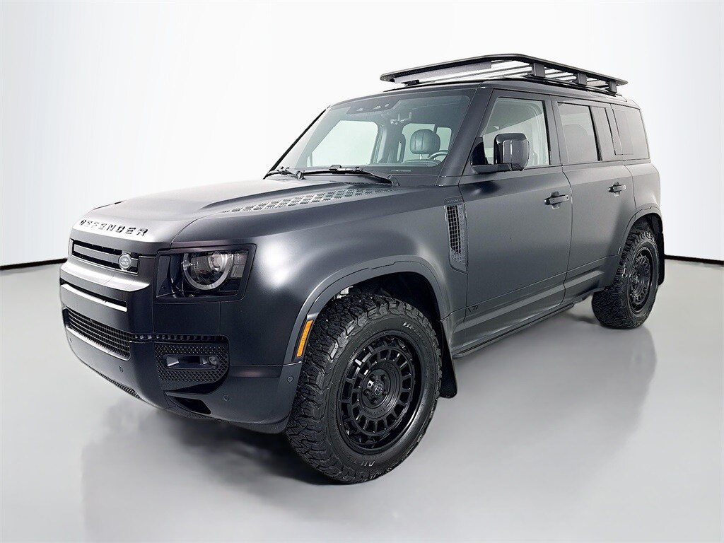 2025 Land Rover Defender 110 V8 Santorini Black with Black Leather. Like New 1-owner local trade with just 6,000 miles. Check out the photos- this one has a full exterior wrap in matte black, Black Rhino Alloy Wheels with BFG A/Ts, Land Rover accessory roof rack, power retracting side steps and more!